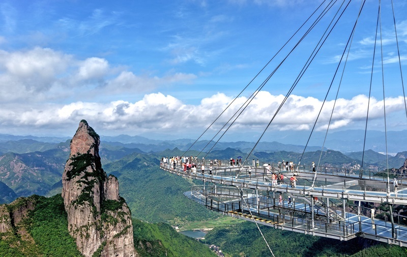 7月5日,游客在浙江省臺(tái)州市仙居縣神仙居景區(qū)南天頂玻璃觀景臺(tái)上游玩(無(wú)人機(jī)照片)。