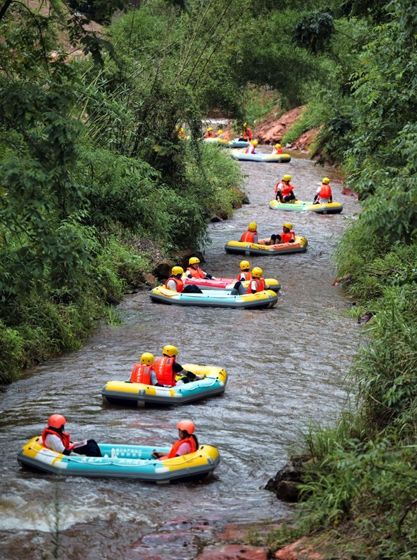 7月5日,四川省瀘州市納溪區(qū)黃龍湖景區(qū),游客在叢林河流上漂流。