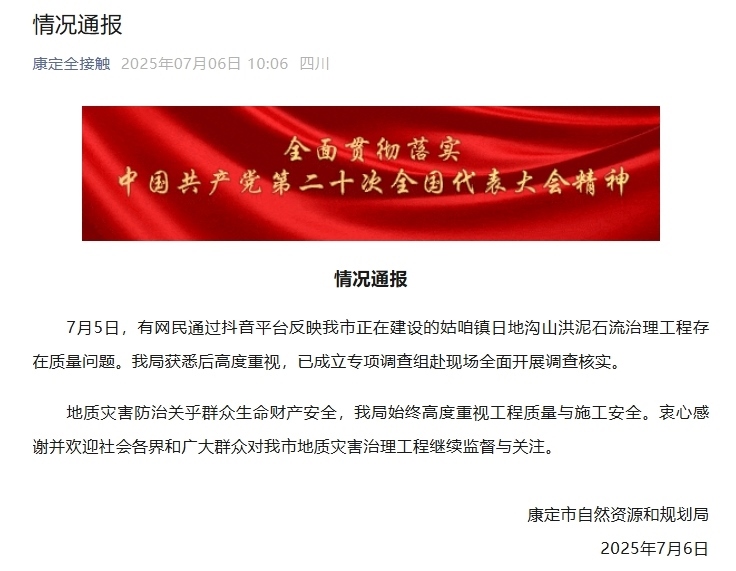中新網(wǎng)7月6日電 據(jù)“康定全接觸”微信公眾號(hào)消息,7月5日,有網(wǎng)民通過抖音平臺(tái)反映四川省康定市正在建設(shè)的姑咱鎮(zhèn)日地溝山洪泥石流治理工程存在質(zhì)量問題。康定市自然資源和規(guī)劃局獲悉后高度重視,已成立專項(xiàng)調(diào)查組赴現(xiàn)場全面開展調(diào)查核實(shí)。