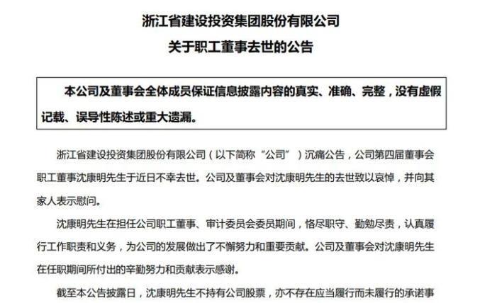 浙江省建設(shè)投資集團(tuán)股份有限公司(下稱“浙江建投”)(002761.SZ)于7月3日公告稱,集團(tuán)職工董事沈康明于近日不幸去世,年僅54歲。
