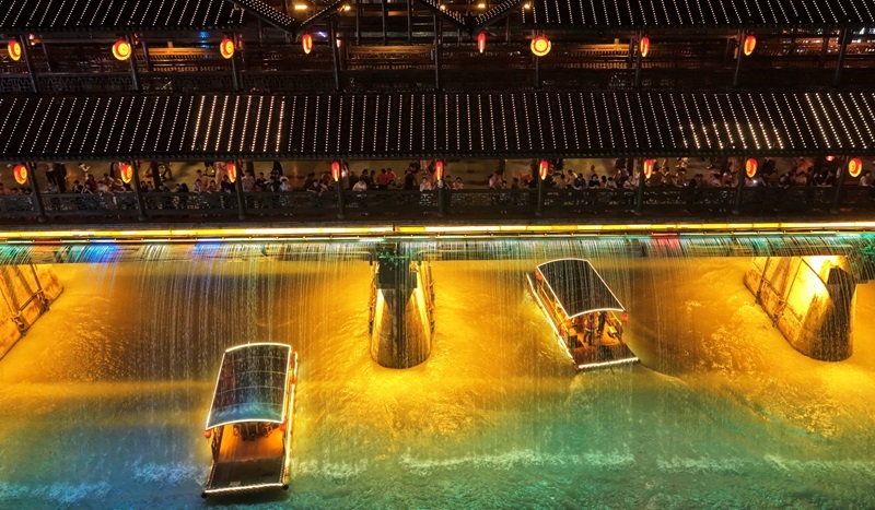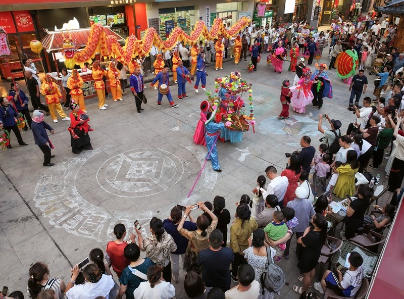 7月10日,民間藝人在利川市非遺美食街為游客表演節(jié)目(無人機照片)。