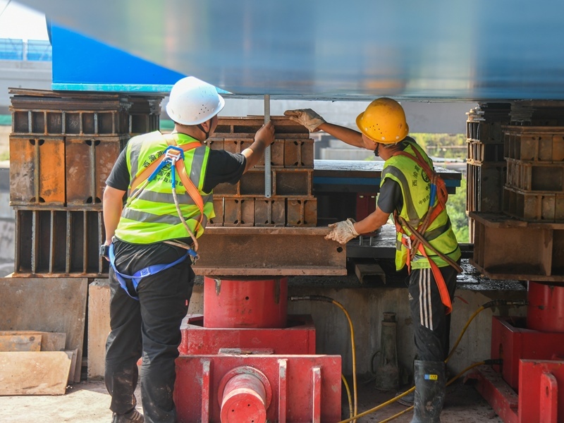 7月11日,工人在西渝高鐵跨營達(dá)高速公路大橋進行頂推施工作業(yè)。