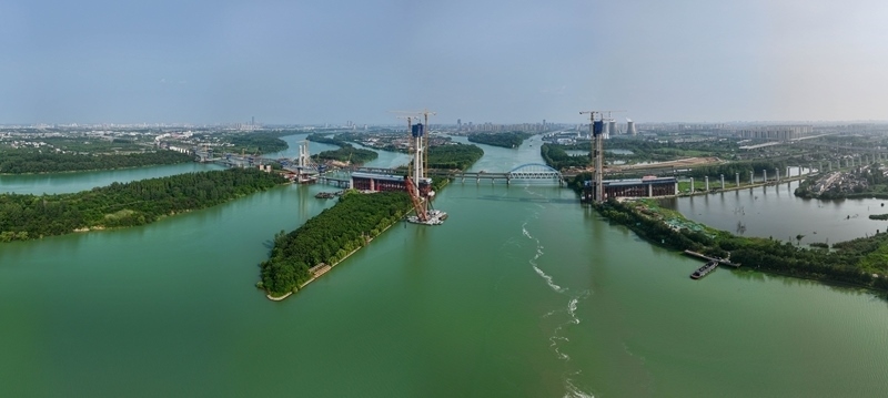 這是滬渝蓉高鐵跨京杭運(yùn)河斜拉橋施工現(xiàn)場(chǎng)(7月13日攝,無(wú)人機(jī)照片)。