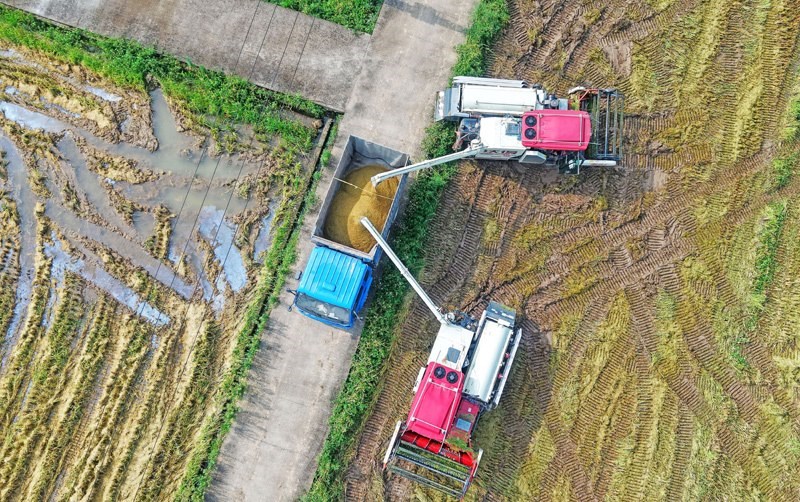 7月15日,在浙江省臺(tái)州市仙居縣下各鎮(zhèn),農(nóng)民將剛收割的稻谷裝車(無人機(jī)照片)。