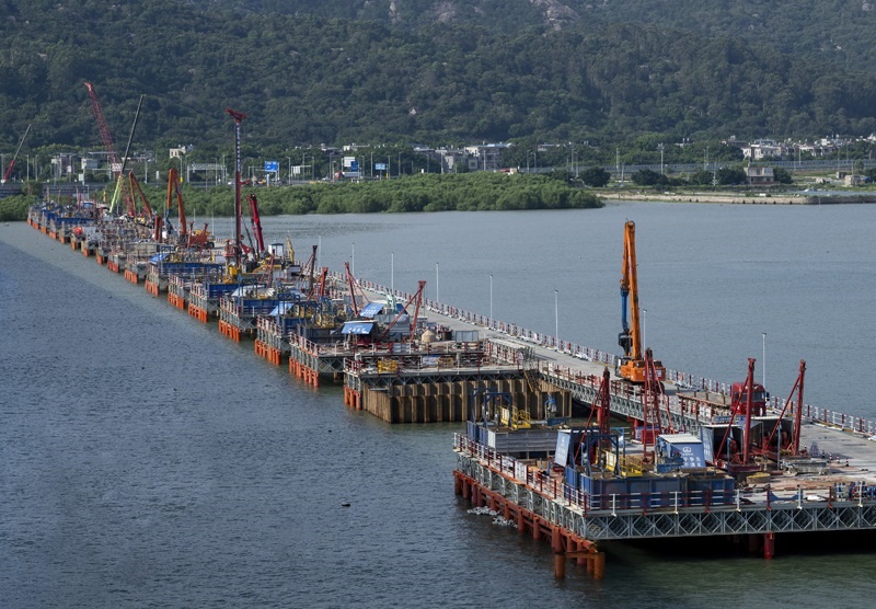這是漳江灣跨海特大橋主棧橋樁基施工現(xiàn)場(chǎng)(7月16日攝)。