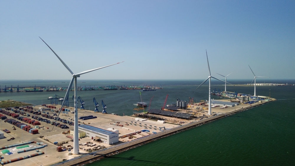 在山東濰坊港,風(fēng)力發(fā)電機(jī)為港區(qū)提供電力(2025年6月12日攝,無人機(jī)照片)。新華社記者 徐速繪 攝