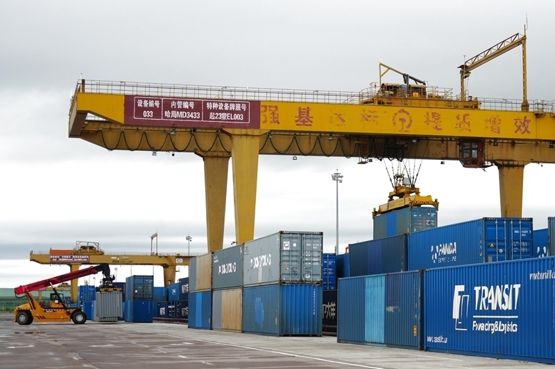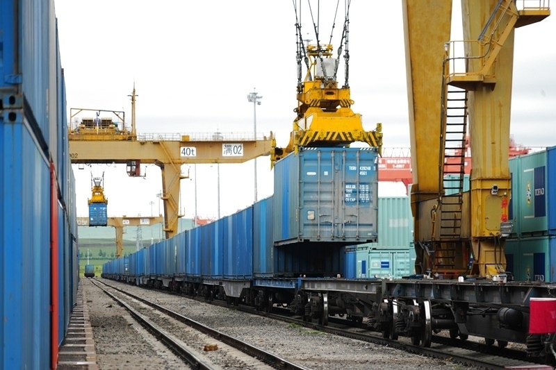 7月25日,回程中歐班列在中國(guó)鐵路哈爾濱局集團(tuán)有限公司滿洲里站集裝箱換裝場(chǎng)內(nèi)進(jìn)行換裝作業(yè)。