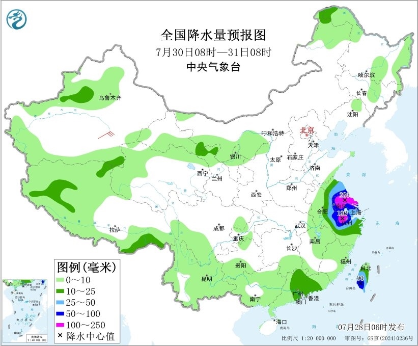 7月30日08時至31日08時,江蘇中南部、上海、安徽東部、浙江北部等地有大到暴雨,部分地區(qū)有大暴雨(100~220毫米);臺灣島中南部有大到暴雨。東海西北部海域、臺灣以東洋面、巴士海峽將有7~8級、陣風(fēng)9級的西南風(fēng)。