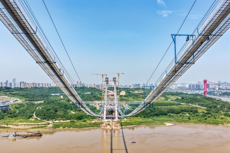 當日,由重慶城投集團投資、城投建設公司組織建設、中國鐵建大橋局承建的黃桷沱長江大橋順利完成主纜架設工作,標志著大橋建設即將進入鋼桁梁吊裝工序。黃桷沱長江大橋全長1260米,主跨765米,為單跨懸吊雙塔三跨連續(xù)鋼桁梁懸索橋,是國內最大跨徑公軌兩用懸索橋。黃桷沱長江大橋是渝長高速復線連接道工程的控制性節(jié)點工程,建成后將成為聯(lián)系重慶主城區(qū)長江南北兩岸的重要交通干道。