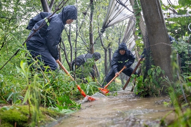 7月30日,在浙江省湖州市長(zhǎng)興縣夾浦鎮(zhèn)長(zhǎng)平村一處葡萄基地,黨員志愿者、民兵幫助農(nóng)戶排水通渠。