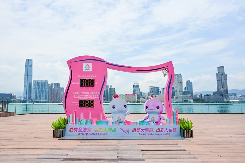 這是8月1日拍攝的香港維港沿岸的第十五屆全國運(yùn)動(dòng)會(huì)倒計(jì)時(shí)牌。