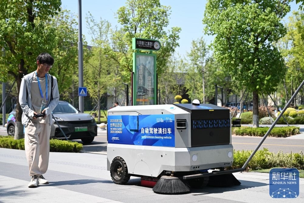 ↑ 在成都世運會運動員村,工作人員引導(dǎo)自動駕駛清掃車前往清掃區(qū)域。新華社記者 胥冰潔 攝