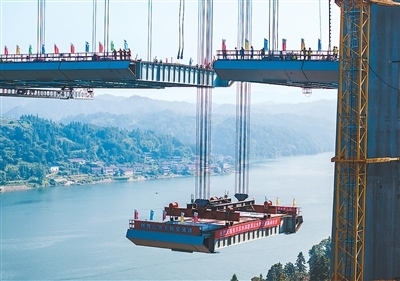 8月3日,由湖南路橋建設(shè)集團(tuán)承建的張官高速控制性工程洞庭溪沅水特大橋主橋順利合龍,為2026年全線通車(chē)奠定堅(jiān)實(shí)基礎(chǔ)。張官高速公路北起張家界市永定區(qū),南至懷化市沅陵縣官莊鎮(zhèn),是國(guó)家高速公路網(wǎng)呼和浩特—北海高速公路的重要組成部分。圖為大橋施工現(xiàn)場(chǎng),一塊鋼混結(jié)合梁在被緩緩提升。新華社記者 陳思汗攝