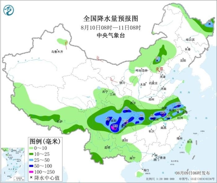 全國降水量預(yù)報圖(8月9日08時-10日08時) 圖片來源:中央氣象臺網(wǎng)站