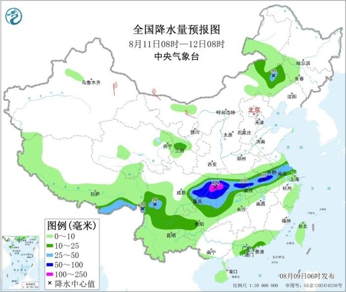 8月10日08時至11日08時,陜西南部、河南南部、四川大部、重慶大部、湖北大部、安徽中南部、江蘇中南部、上海、浙江北部以及內(nèi)蒙古東南部、黑龍江東北部等地部分地區(qū)有中到大雨,其中,安徽西南部、江蘇中南部、湖北東部和西南部、四川盆地中東部和西南部、重慶中西部和東北部、云南東北部等地部分地區(qū)有暴雨或大暴雨(100~150毫米)。內(nèi)蒙古西北部、新疆沿天山地區(qū)等地部分地區(qū)有4~5級風(fēng)。東海北部海域?qū)⒂?~7級風(fēng)、陣風(fēng)8級,黃海南部海域、東海南部海域?qū)⒂?~6級風(fēng)、陣風(fēng)7級。