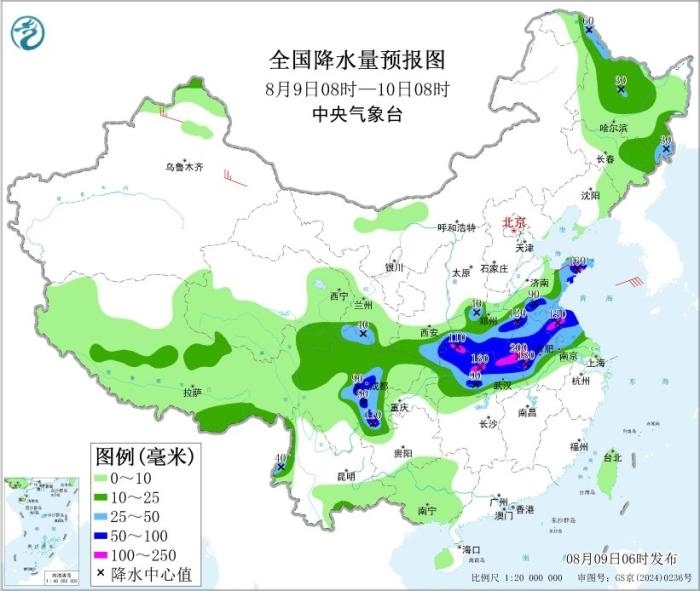 8月9日08時至10日08時,青海東南部、甘肅南部、川西高原北部、陜西南部、河南大部、山東東部和南部、湖北大部、安徽中北部、江蘇中北部、四川盆地西部和南部以及黑龍江中北部、吉林東部、西藏東南部等地部分地區(qū)有中到大雨,其中,陜西南部、山東東部和南部、河南東北部和中南部、安徽中北部、江蘇北部、湖北北部、四川盆地西部和南部等地部分地區(qū)有暴雨或大暴雨(100~200毫米)。新疆北疆北部和東部、山東半島等地部分地區(qū)有4~5級風(fēng)。黃海中部海域?qū)⒂?~7級風(fēng)、陣風(fēng)8級,黃海南部海域、東海北部海域?qū)⒂?~7級風(fēng)、陣風(fēng)8級,渤海、東海南部海域?qū)⒂?~6級風(fēng)、陣風(fēng)7級。