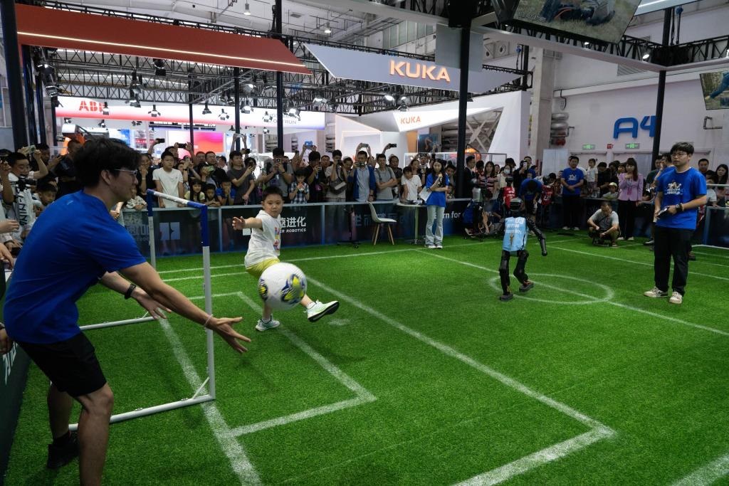 8月8日,觀眾在2025世界機(jī)器人大會(huì)上與機(jī)器人踢足球。新華社記者謝晗攝