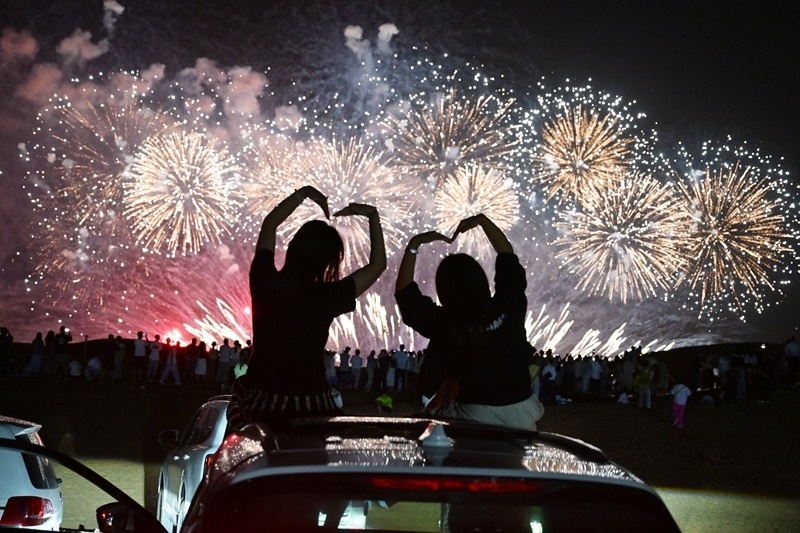 8月10日,游客在寧夏中衛(wèi)市沙坡頭區(qū)觀看煙花表演。
