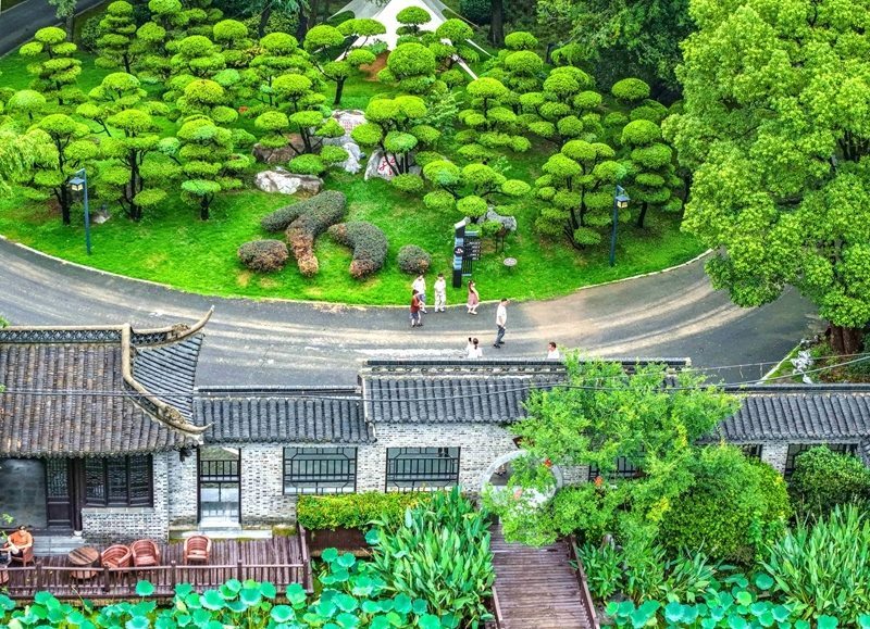 8月10日,游客在江蘇省揚州市江都區(qū)丁伙鎮(zhèn)樸園游玩(無人機照片)。