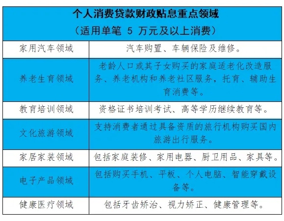 ●貼息范圍包括單筆5萬元以下消費(fèi),以及單筆5萬元及以上的家用汽車、養(yǎng)老生育、教育培訓(xùn)、文化旅游、家居家裝、電子產(chǎn)品、健康醫(yī)療等重點(diǎn)領(lǐng)域消費(fèi)。
