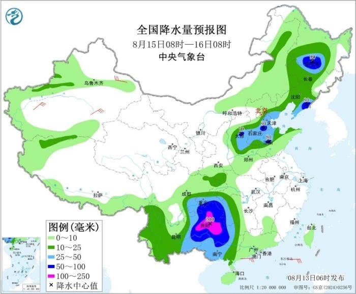 8月15日08時至16日08時,貴州、廣西西部和北部、湖南西部、四川盆地東南部、重慶南部和黑龍江南部、吉林北部、遼寧南部、華北中南部、山東北部等地部分地區(qū)有中到大雨,其中,貴州大部、廣西北部和黑龍江西南部、吉林北部、遼寧東南部、山西東部、河北東南部、山東西部、重慶東南部等地部分地區(qū)有暴雨或大暴雨(100~200毫米)。