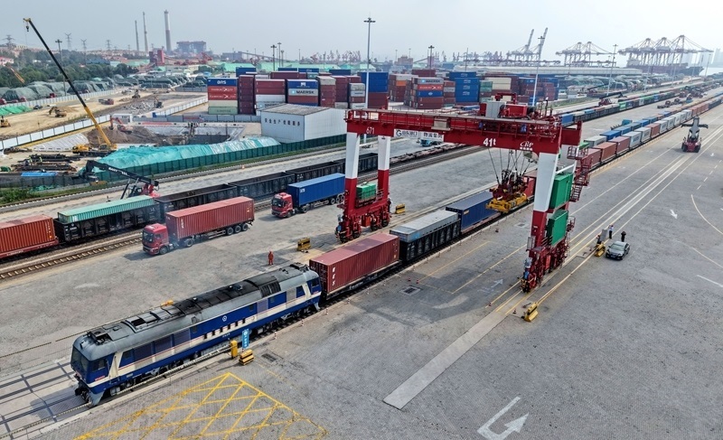 這是8月19日拍攝的山東港口青島港前灣港區(qū)海鐵聯(lián)運(yùn)中心堆場(chǎng)(無(wú)人機(jī)照片)。