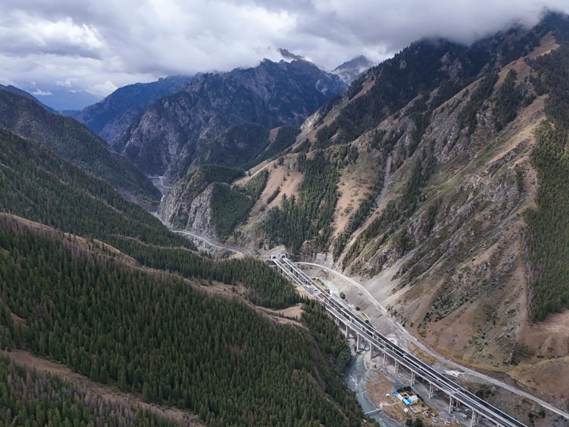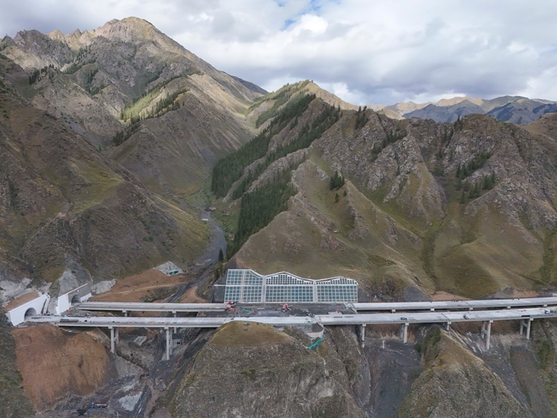 工人在新疆烏尉高速公路躍進(jìn)3號(hào)隧道南端施工(8月19日攝,無人機(jī)照片)。