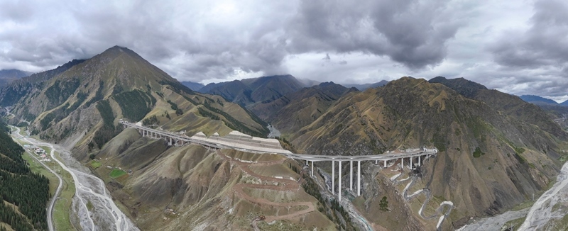 新疆烏尉高速公路穿越天山山脈(8月19日攝,無人機(jī)全景照片)。