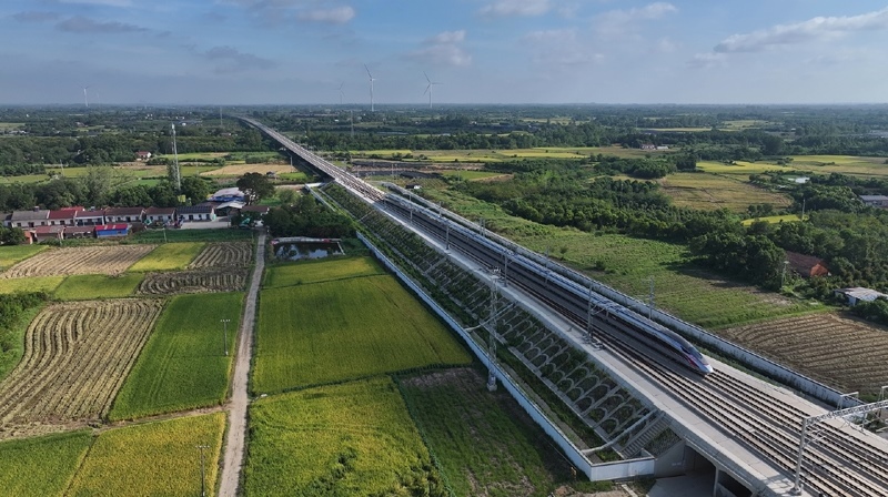 8月23日,試驗列車從荊門市沙洋西站折返,駛向襄陽東站(無人機照片)。