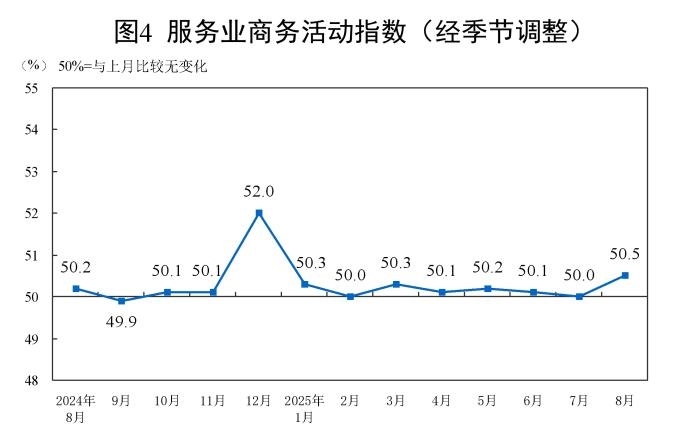 8月份,非制造業(yè)商務(wù)活動(dòng)指數(shù)為50.3%,比上月上升0.2個(gè)百分點(diǎn),高于臨界點(diǎn),非制造業(yè)繼續(xù)保持?jǐn)U張。
