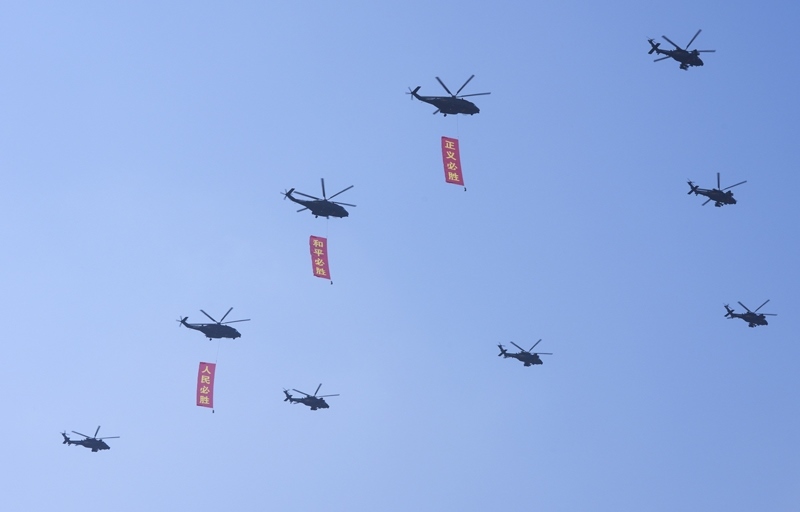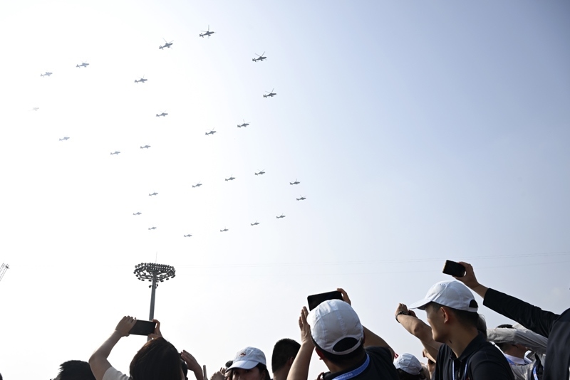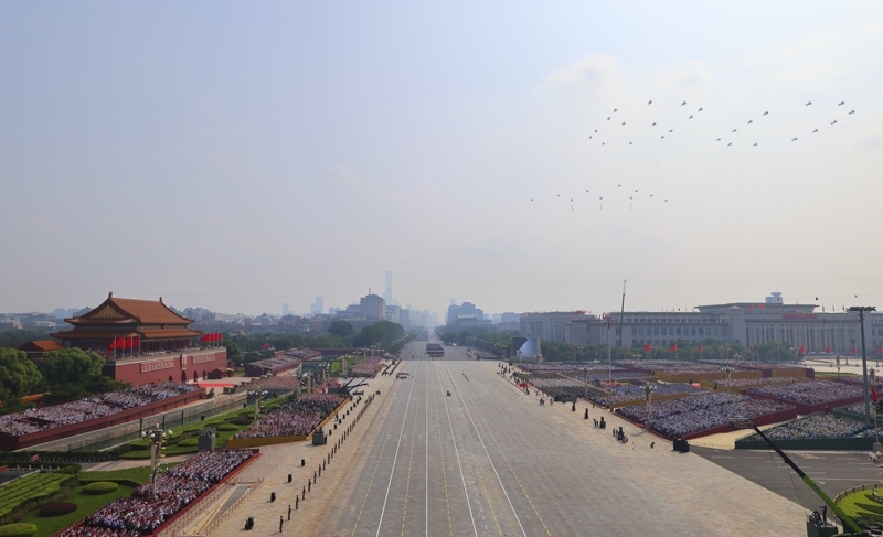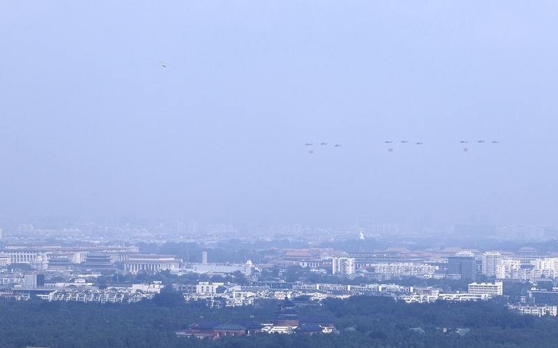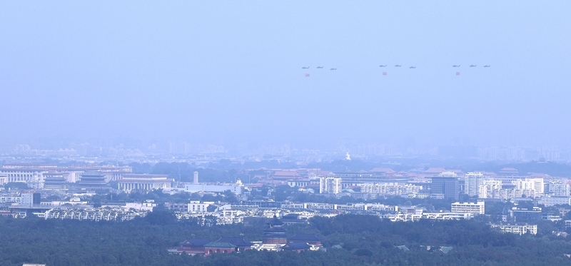 9月3日,紀(jì)念中國人民抗日戰(zhàn)爭暨世界反法西斯戰(zhàn)爭勝利80周年大會在北京隆重舉行。這是空中護(hù)旗梯隊(duì)。