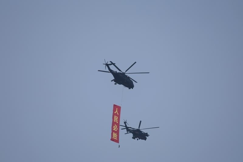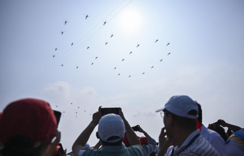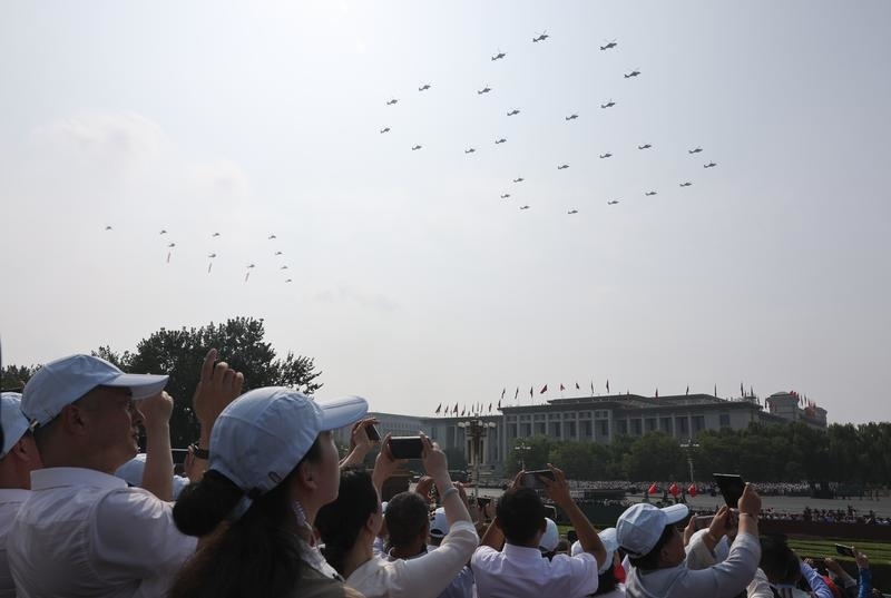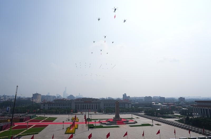 9月3日,紀念中國人民抗日戰(zhàn)爭暨世界反法西斯戰(zhàn)爭勝利80周年大會在北京隆重舉行。這是空中護旗梯隊飛過天安門廣場上空,26架直升機匯成巨大的“80”字樣。