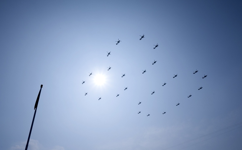 9月3日,紀(jì)念中國(guó)人民抗日戰(zhàn)爭(zhēng)暨世界反法西斯戰(zhàn)爭(zhēng)勝利80周年大會(huì)在北京隆重舉行。這是空中護(hù)旗梯隊(duì)。
