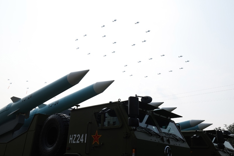 9月3日,紀(jì)念中國(guó)人民抗日戰(zhàn)爭(zhēng)暨世界反法西斯戰(zhàn)爭(zhēng)勝利80周年大會(huì)在北京隆重舉行。這是空中護(hù)旗梯隊(duì)從反艦導(dǎo)彈方隊(duì)上空飛過(guò)。