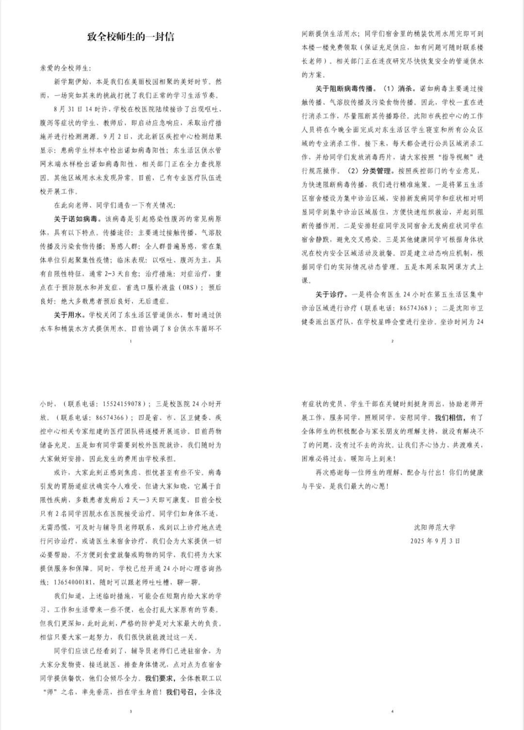 9月3日,沈陽師范大學發(fā)布的《致全校師生的一封信》(以下簡稱“《一封信》”)中稱,8月31日14時許,學校在校醫(yī)院陸續(xù)接診了出現(xiàn)嘔吐、腹瀉等癥狀的學生、教師。相關(guān)部門正在全力查找原因,目前已有專業(yè)醫(yī)療隊伍進校開展工作。