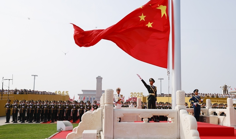 2025年9月3日,紀(jì)念中國人民抗日戰(zhàn)爭暨世界反法西斯戰(zhàn)爭勝利80周年大會在北京隆重舉行。這是天安門廣場舉行隆重的升國旗儀式。新華社記者 費茂華 攝