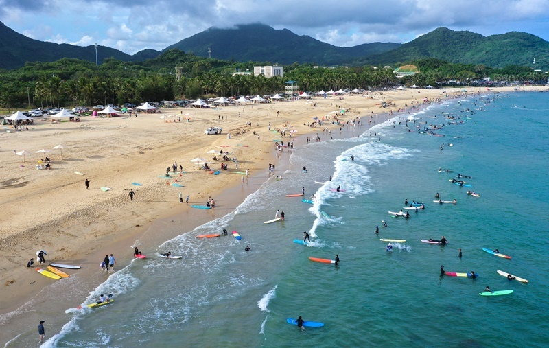 10月2日,游客在海南萬(wàn)寧日月灣沖浪(無(wú)人機(jī)照片)。