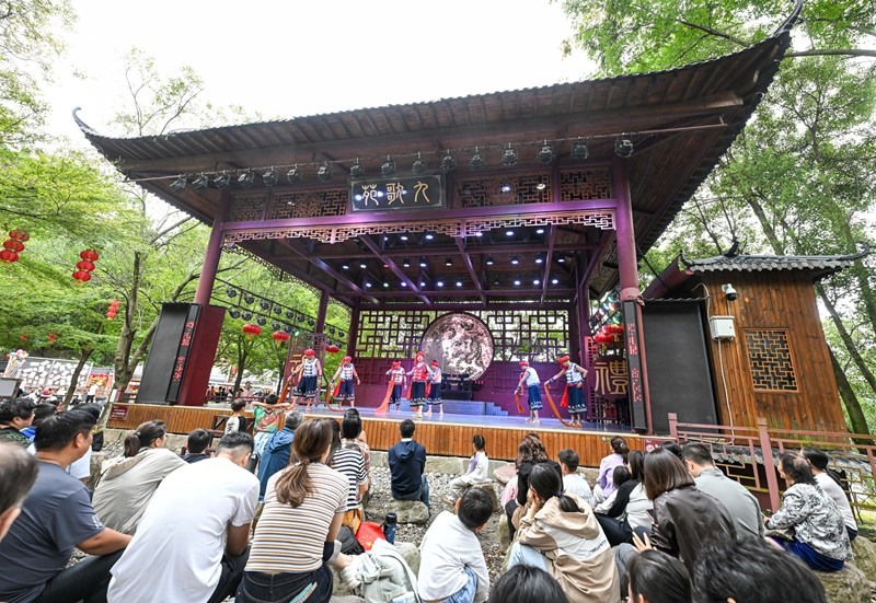 10月3日,人們?cè)诤笔∫瞬酗鰵w縣屈原故里景區(qū)觀看表演。