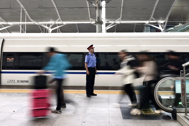 10月6日,在鐵路徐州東站,工作人員引導(dǎo)旅客乘坐列車。