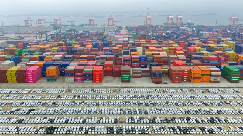 10月13日在山東港口青島港拍攝的外貿(mào)集裝箱碼頭(無人機(jī)照片)。