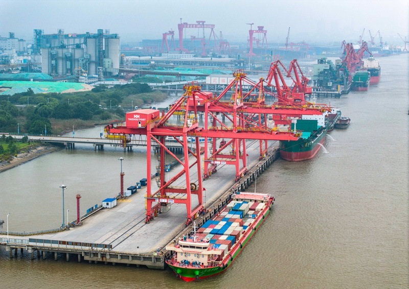 10月13日,在江蘇泰州港集裝箱碼頭,貨船停在泊位裝卸集裝箱(無人機(jī)照片)。