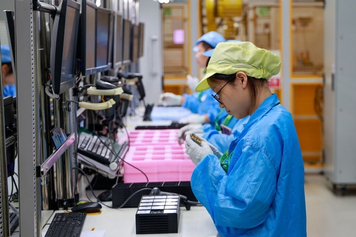 2025年9月15日,工作人員在江蘇無錫高新區(qū)綜合保稅區(qū)捷普電子(無錫)有限公司的生產(chǎn)車間里進行產(chǎn)品檢驗。新華社記者 劉佳琪 攝