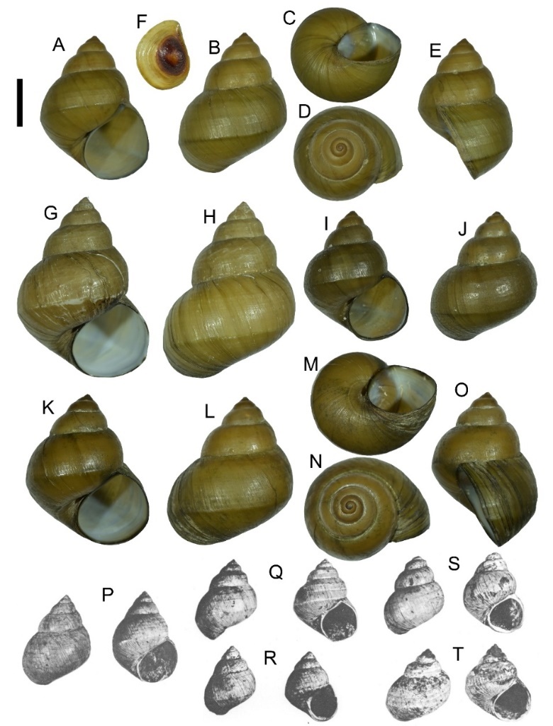 李四光婭田螺的現(xiàn)生個(gè)體貝殼(A—O)以及發(fā)現(xiàn)于第四紀(jì)沉積層的貝殼模式標(biāo)本(P—T)。(中國科學(xué)院昆明動物研究所東南亞野生動物多樣性課題組供圖)