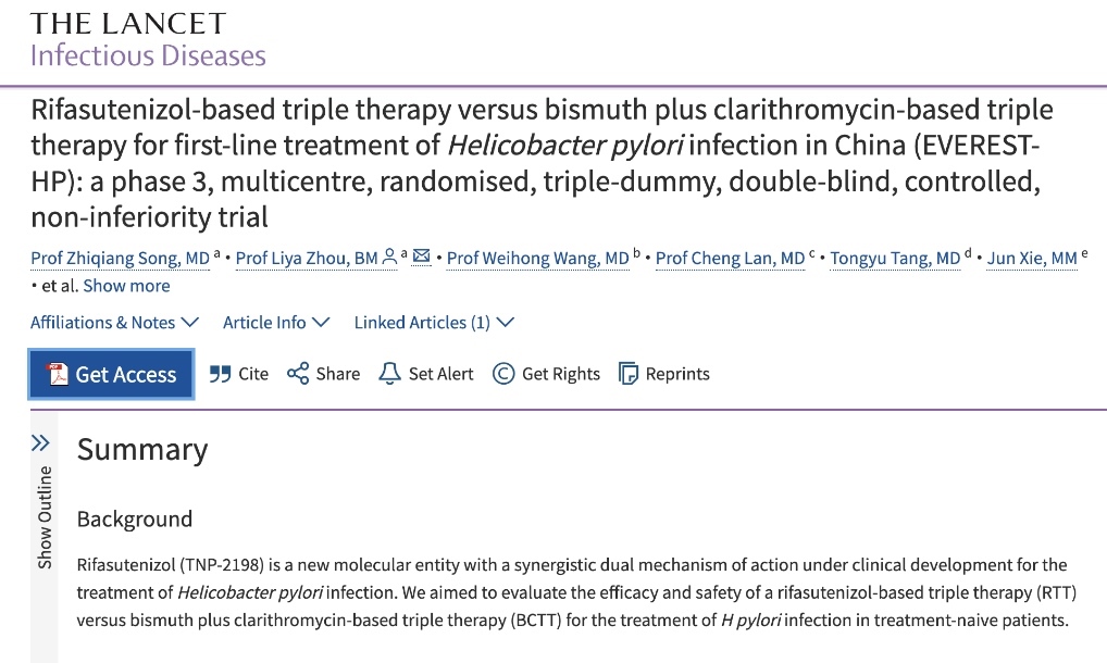 北京大學第三醫(yī)院消化科周麗雅、宋志強教授團隊帶領(lǐng)全國40家醫(yī)療機構(gòu)消化疾病診療中心,通過全球首個Ⅲ期臨床試驗,證實了含利福特尼唑的三聯(lián)方案,比臨床上常用的鉍劑四聯(lián)方案具有更高的根除成功率和更低的不良反應發(fā)生率,而且用藥更少,服用更方便,將為全球幽門螺桿菌感染者帶來了全新的治療選擇。相關(guān)成果日前于《柳葉刀-感染病學》在線發(fā)表。