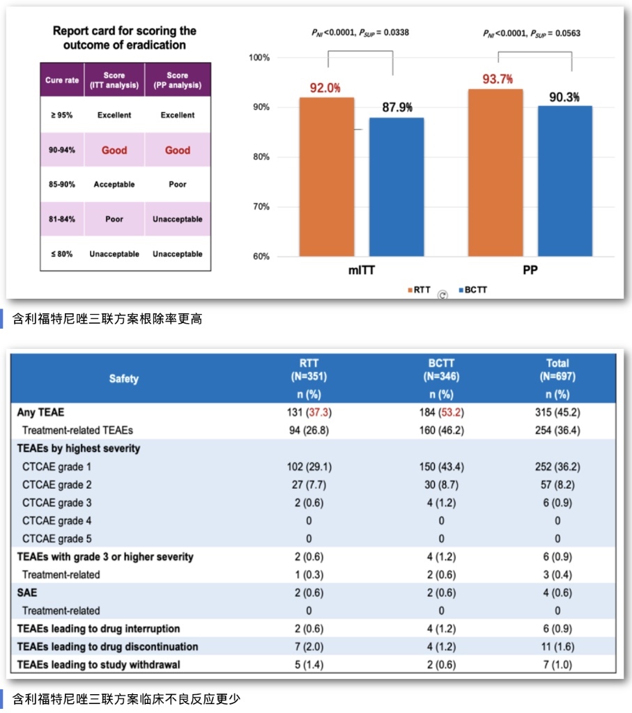 這項在中國開展的多中心、隨機、雙盲、陽性對照研究,納入700例幽門螺桿菌感染初治患者。宋志強介紹,利福特尼唑是我國自主研發(fā)的全球首創(chuàng)新型分子實體藥物,專門針對幽門螺桿菌感染研發(fā)。相關(guān)基礎(chǔ)和臨床研究結(jié)果均顯示,幽門螺桿菌對該藥物普遍敏感,最小抑菌濃度低,有效克服幽門螺桿菌高耐藥問題,而且表現(xiàn)出良好的安全性。