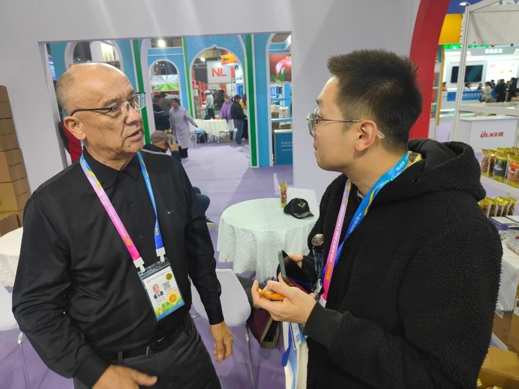 2025年10月24日,塔吉克斯坦杏和公司負責(zé)人普洛特·阿舒羅夫(左)介紹自己參加第32屆中國楊凌農(nóng)業(yè)高新科技成果博覽會的相關(guān)情況。新華社記者 姚友明 攝