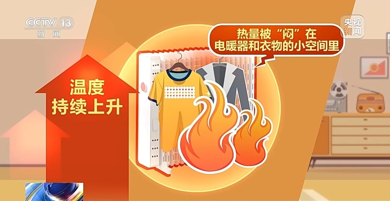 很多人喜歡把衣物放在電暖氣上烤,這是有風(fēng)險的!因為這樣會導(dǎo)致熱量被“悶”在電暖器和衣物的小空間里,形成一個“小烤箱”溫度持續(xù)上升,可能引燃衣物導(dǎo)致火災(zāi)。