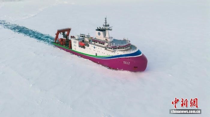 圖為2025年9月,“探索三號(hào)”在北極密集冰區(qū)破冰航行。(中國科學(xué)院深??茖W(xué)與工程研究所 供圖)