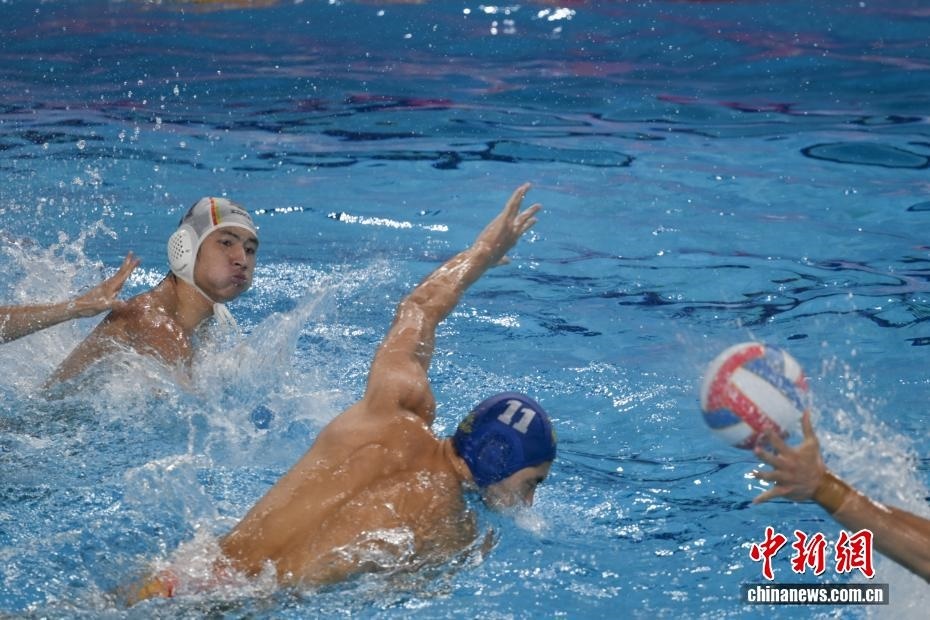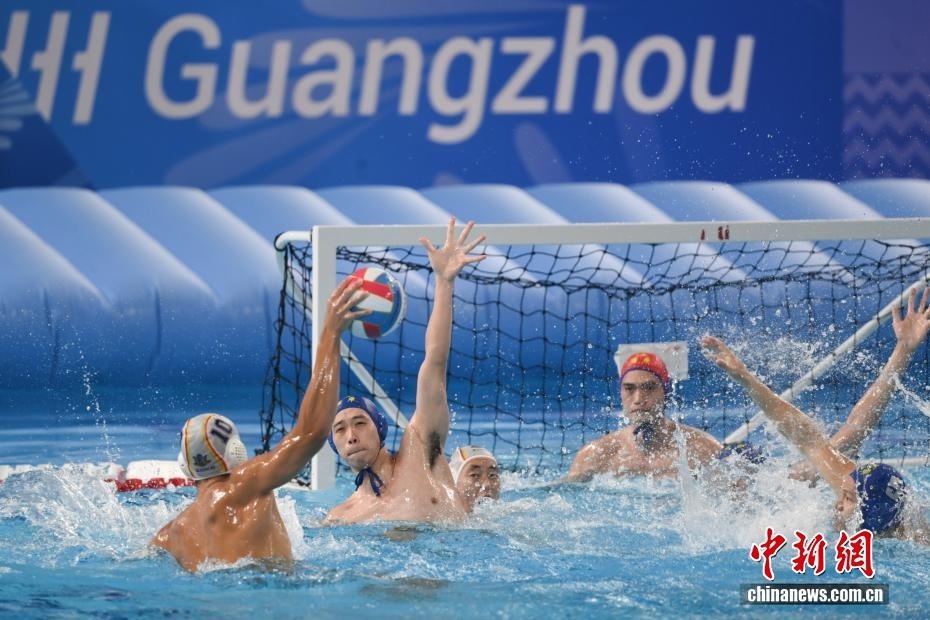 10月27日晚,在廣東廣州舉行的第十五屆全國運(yùn)動會水球男子組比賽金牌賽中,廣東隊以16比9戰(zhàn)勝上海隊,獲得金牌。圖為上海隊11號運(yùn)動員蔡宇浩(白帽)在比賽中進(jìn)攻。