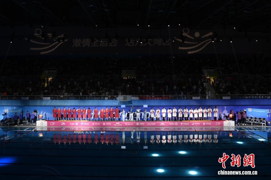 10月27日晚,在廣東廣州舉行的第十五屆全國運(yùn)動會水球男子組比賽金牌賽中,廣東隊(紅衣)以16比9戰(zhàn)勝上海隊(白衣),獲得金牌。圖為雙方運(yùn)動員出場。
